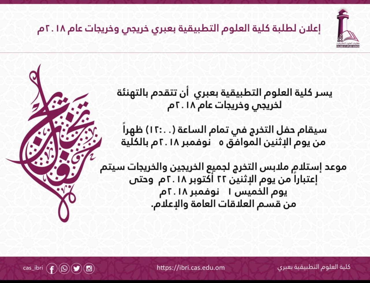 جامعة التقنية والعلوم التطبيقية تطبيقية عبري On Twitter حفل تخريج طلبة وطالبات تطبيقية عبري للعام 2018م يوم الإثنين 5 نوفمبر 2018م استلام ملابس التخرج اعتبارا من يوم الإثنين 22 أكتوبر 2018م Https T Co Nj8atjix6y